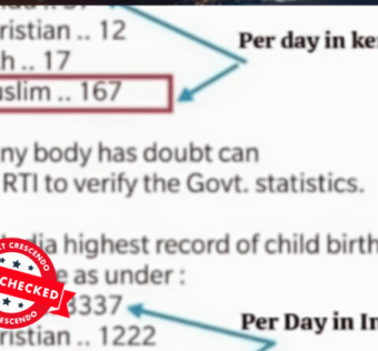 An Instagram post claiming that 58,167 Muslim children are born daily pan-India, whereas 3337 Hindu children are born daily. The post stated that the record of child birth in the government hospitals in Kerala per day is: Hindu: 37 Christian: 12 Sikh: 17 and Muslim: 167 Instagram Link | Archived Link However, as we investigated, […]