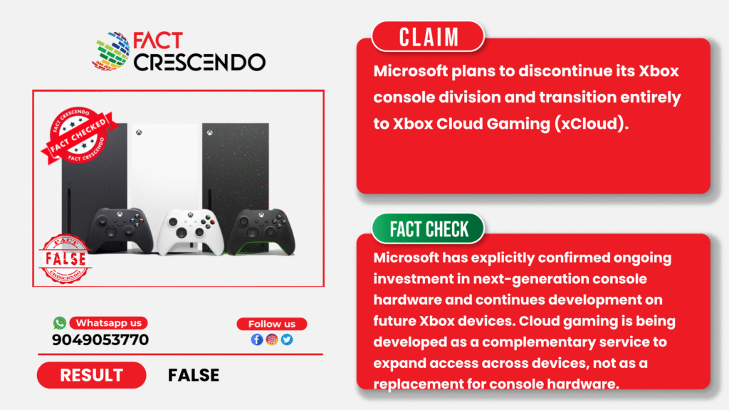 A viral claim circulating on social media alleges that Microsoft plans to discontinue its Xbox console division and make Xbox Cloud Gaming (xCloud) the company’s only platform. However, our verification finds this claim to be false.