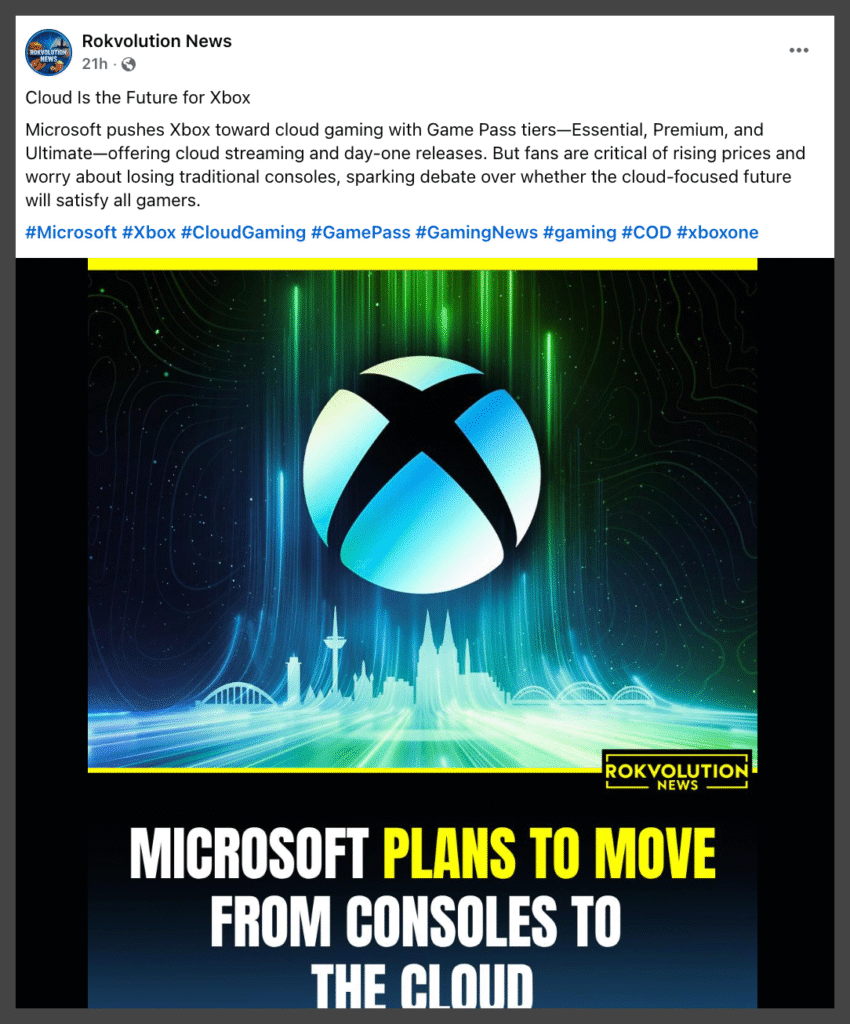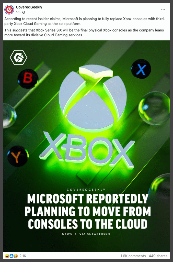 Multiple social media posts claim that Microsoft will “eliminate its console division and go fully third-party,” implying that all future Xbox titles will be played exclusively through xCloud. Some posts further claim that the current Xbox Series S|X generation will be the last.