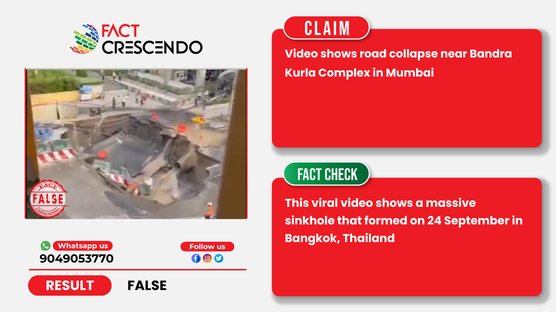 A video of a road collapsing and generating a big sinkhole near a high-rise apartment building has gone viral on social media with the claim that it shows a road collapse near the Bandra Kurla Complex in Mumbai.