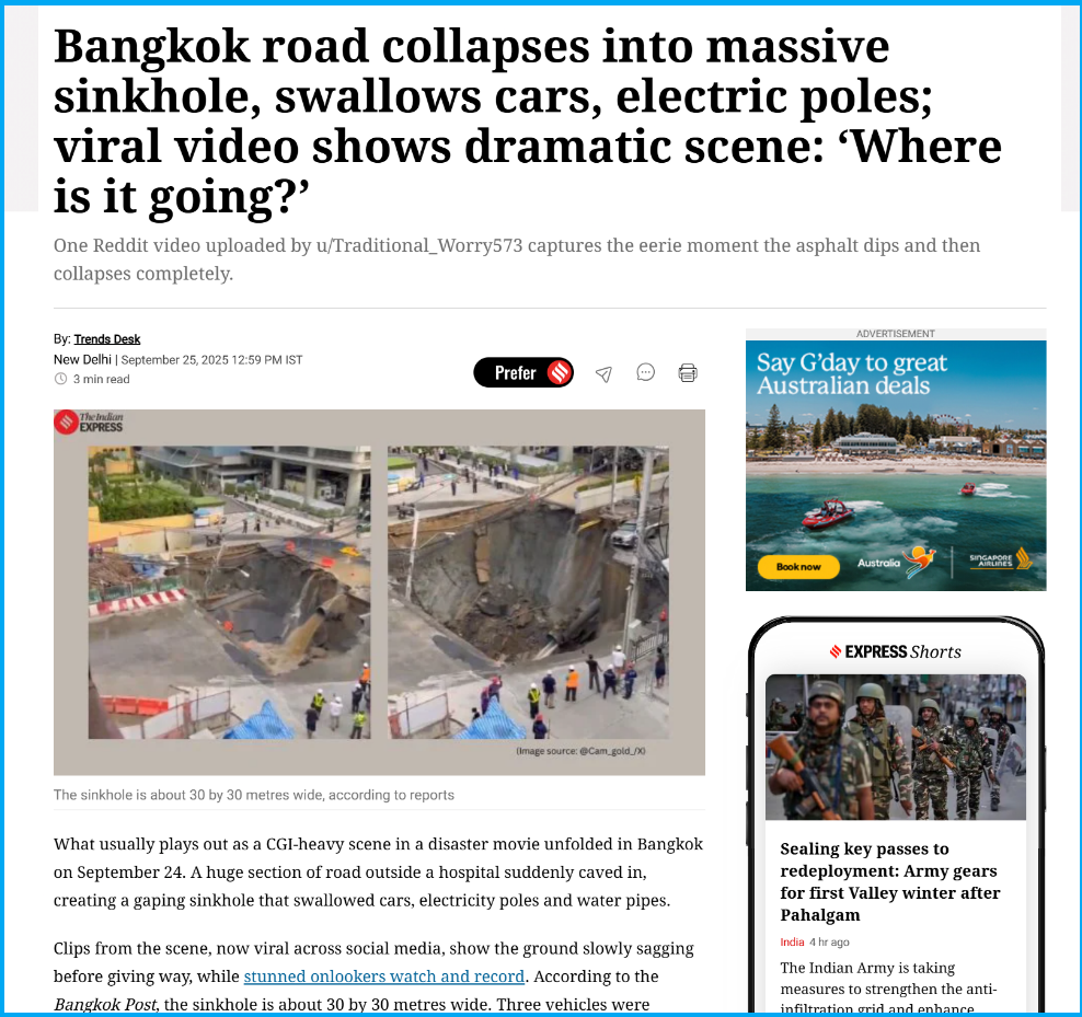 Moving forward, we found several news reports regarding this incident. An article published by The Indian Express on 25 September, 2025 includes the screenshots from the same video. The report credited a Reddit user for sharing the clip and stated that the incident occurred in Bangkok, Thailand’s capital, on September 24, 2025, outside a hospital.