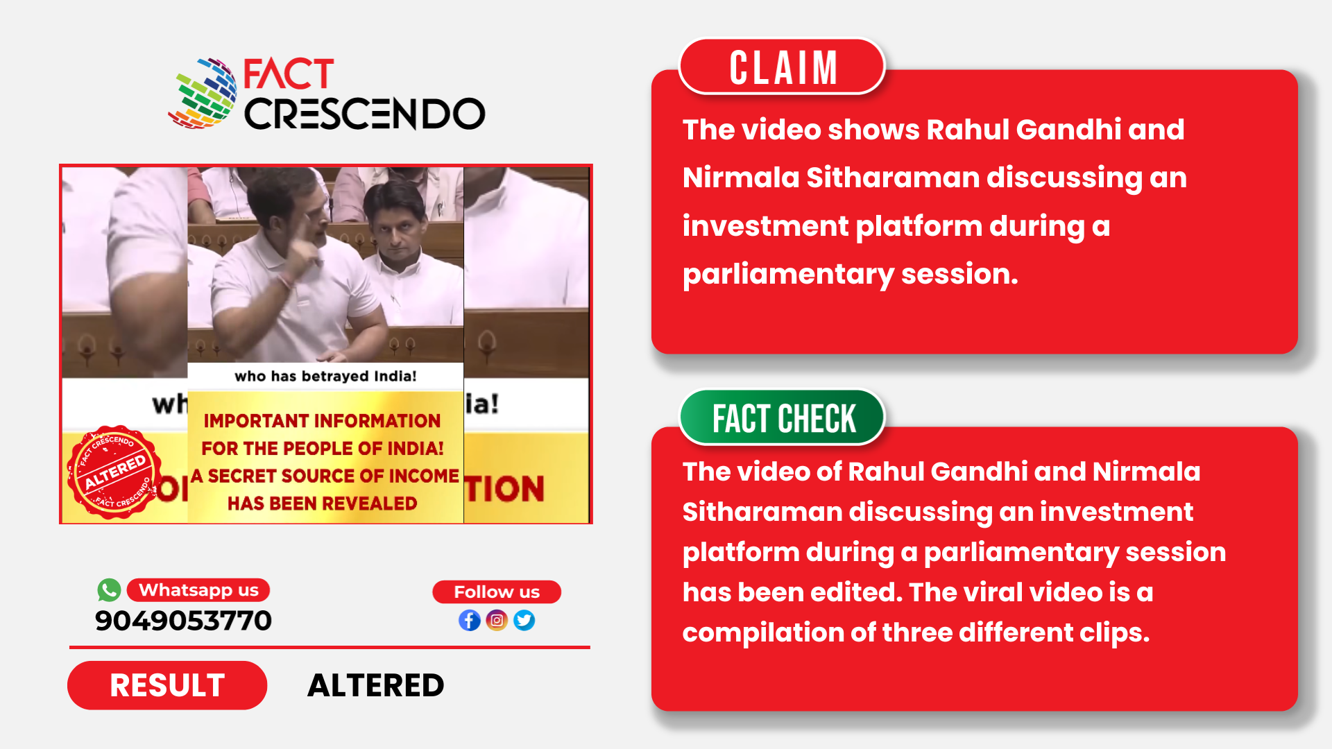 From our investigation, we can say that the viral video is altered. The video of Rahul Gandhi and Nirmala Sitharaman discussing an investment platform during a parliamentary session has been edited. The viral video is a compilation of three different clips.