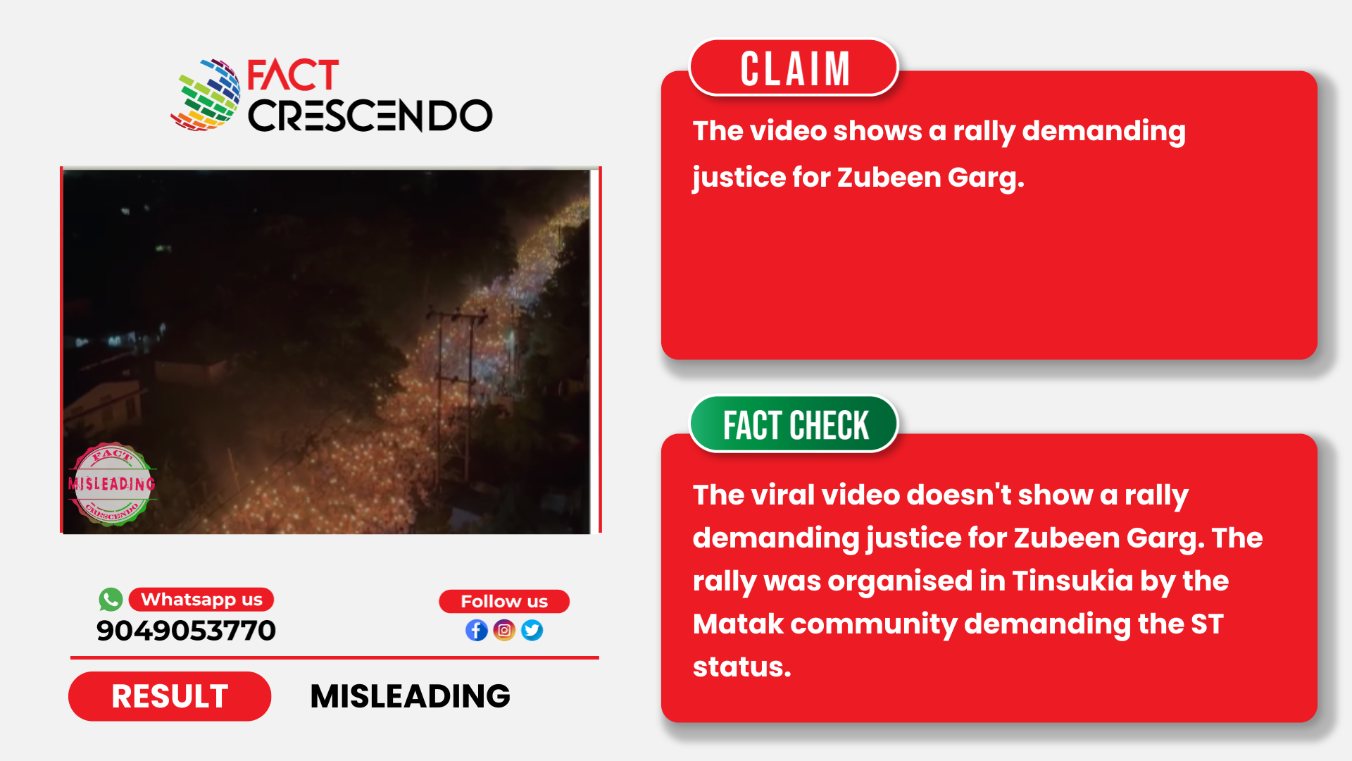 From our investigation, we can say that the claim is misleading. The viral video doesn’t show a rally demanding justice for Zubeen Garg. The rally was organised in Tinsukia by the Matak community demanding the ST status.