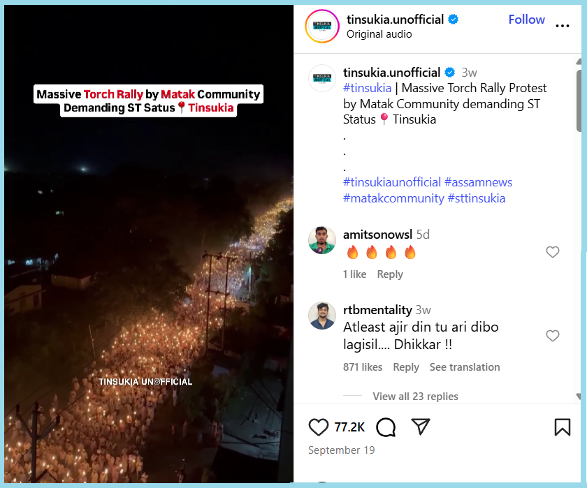 We found the same video on an Instagram handle on 19 September 2025, which mentioned the video as a torch rally by the Matak community in Tinsukia demanding the ST status.