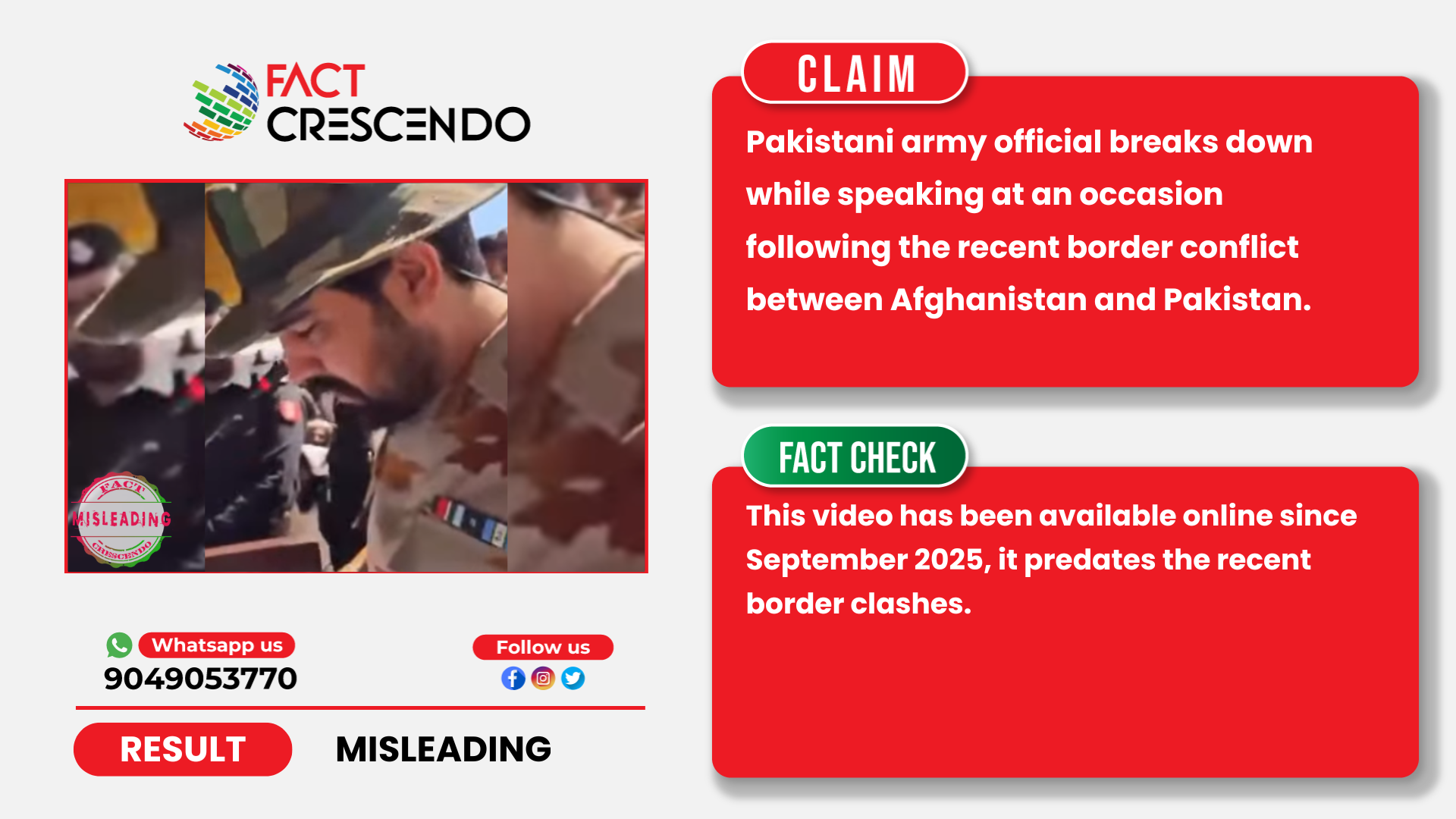 Intense clashes erupted along the Pakistan-Afghanistan border on 8 October after an attack by the Afghan Taliban on Pakistani military posts led to a heavy exchange of fire and reportedly left dozens of soldiers dead. Against this backdrop, a video showing a Pakistan army officer breaking down while speaking at an event is going viral on social media. The users who share the video claims that it took place after the recent border clash between Afghanistan and Pakistan in October 2025.