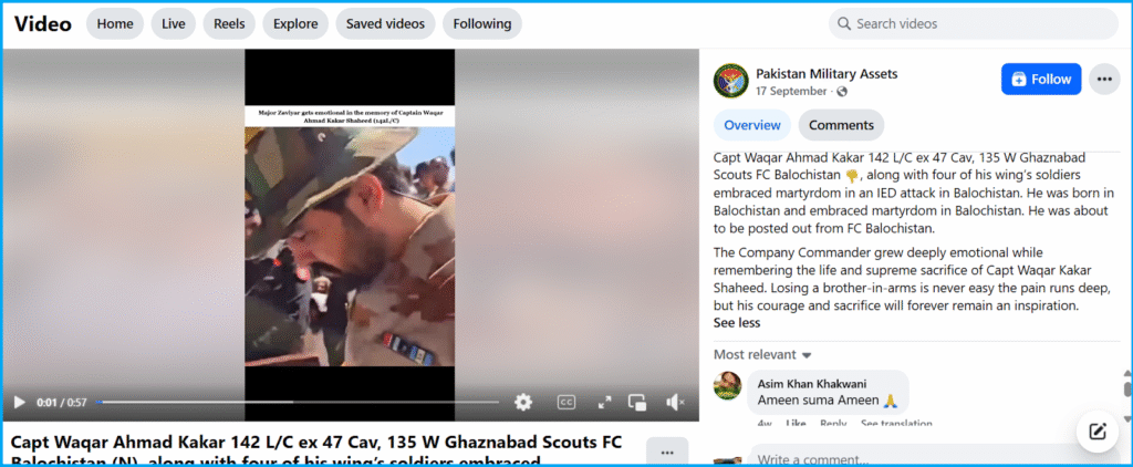We started the investigation with a reverse image search on Google and the results led us to the same video uploaded on Facebook by Pakistan Military Assets on 17 September. The description states, “Capt. Waqar Ahmad Kakar 142 L/C ex 47 Cav, 135 W Ghaznabad Scouts FC Balochistan, along with four of his wing’s soldiers embraced martyrdom in an IED attack in Balochistan. The Company Commander grew deeply emotional while remembering the life and supreme sacrifice of Capt. Waqar Kakar Shaheed.”