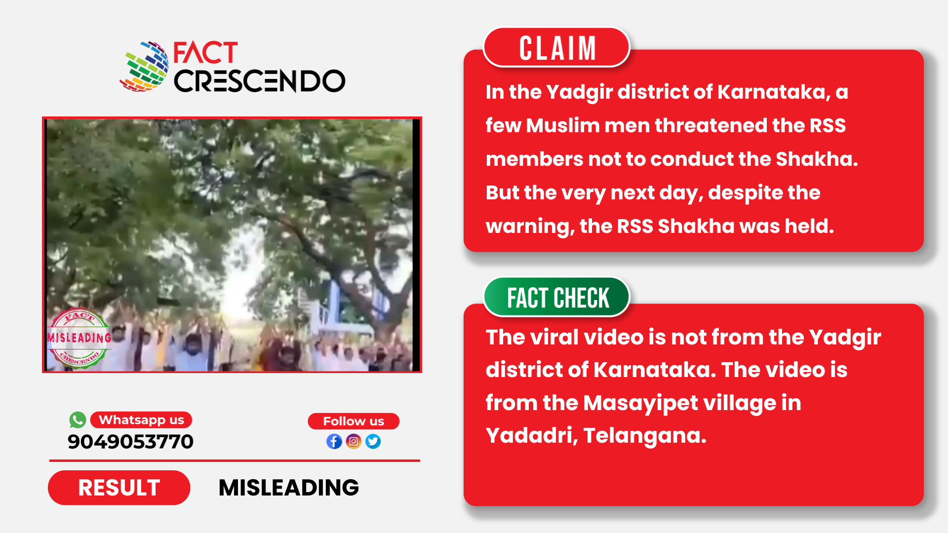 Recently, a video went viral on social media claiming that a group of Muslim men threatened the RSS members not to conduct the RSS Shakha in Yadgir district of Karnataka. But the very next day, despite the warning, the RSS Shakha was held.