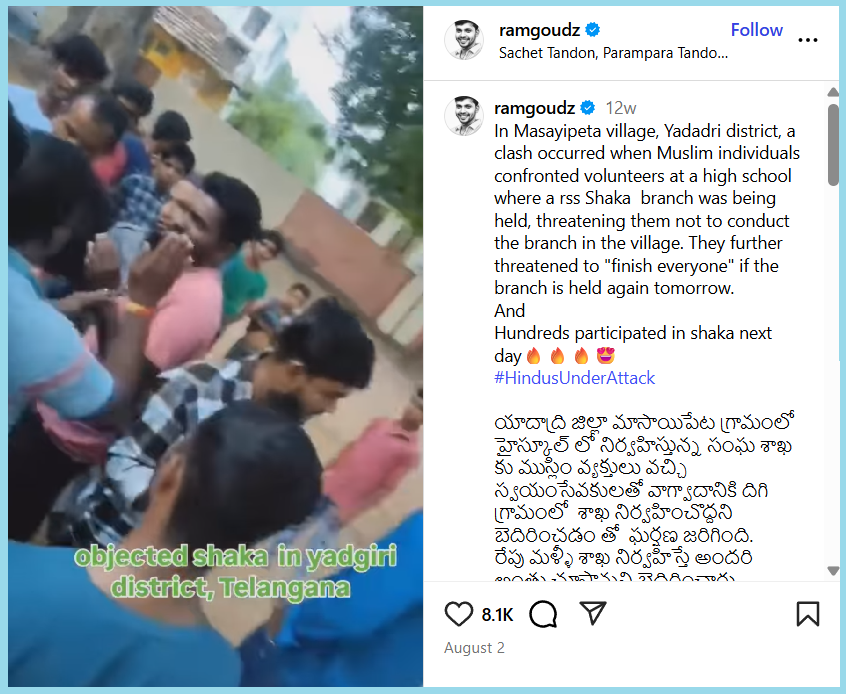 The caption of the video read, “In Masayipeta village, Yadadri district, a clash occurred when Muslim individuals confronted volunteers at a high school where a rss Shaka branch was being held, threatening them not to conduct the branch in the village. They further threatened to “finish everyone” if the branch is held again tomorrow.