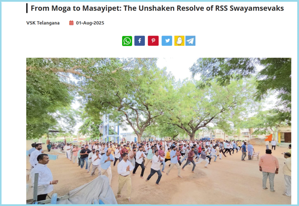 A report published on VSK Telangana on 1 August 2025 that contained a screenshot similar to the viral video reads, “…Fast forward to July 30, 2025, in the village of Masayipet, Yadadri district of Telangana. As an RSS shakha was about to be held, a few miscreants approached and warned that such shakhas should not be conducted there. But just like in Moga, the swayamsevaks remained unfazed. The very next day, the shakha resumed at the scheduled time, and it will continue in the future as well.”