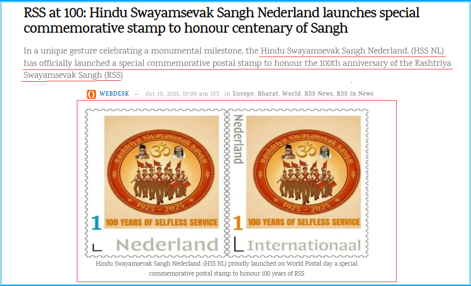 A reverse image search revealed that the postage stamp was shared on the website of the Rashtriya Swayamsevak Sangh’s mouthpiece, Organiser on 10 October 2025. According to the accompanying information, an organization called Hindu Swayamsevak Sangh (HSS NL) in the Netherlands released this postage stamp on October 9, World Post Day, to mark the centenary of the Rashtriya Swayamsevak Sangh.