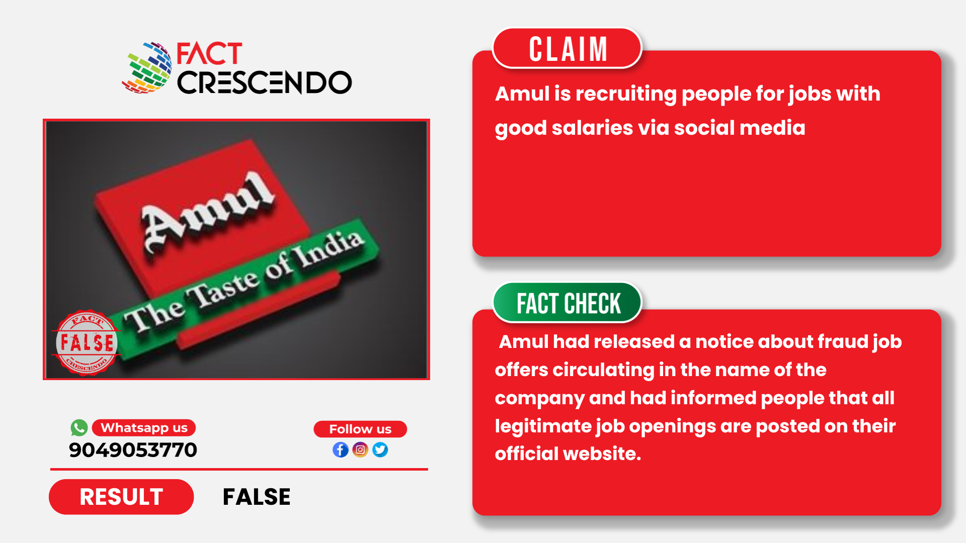Fact Crescendo found the claim to be false. Amul had released a notice about fraud job offers circulating in the name of the company and had informed people that all legitimate job openings are posted on their official website.