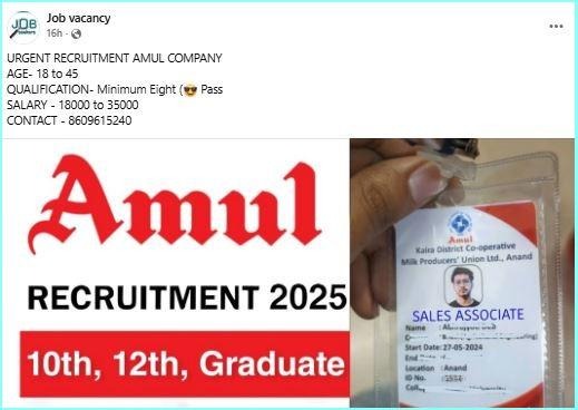 Currently, social media posts regarding recruitment to Amul company are going viral on social media. It was noticed that many social media users are posting job offers in the name of the company with attractive salaries and good incentives for the aspiring people who are not highly qualified.