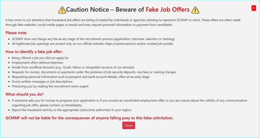 A relevant keyword search led us to Amul’s website in which a warning notice on fake job offers was published. The notice reads, “It has come to our attention that fraudulent job offers are being circulated by individuals or agencies claiming to represent GCMMF or Amul. These offers are often made through fake websites, social media pages or emails and may request personal information or payment from candidates.