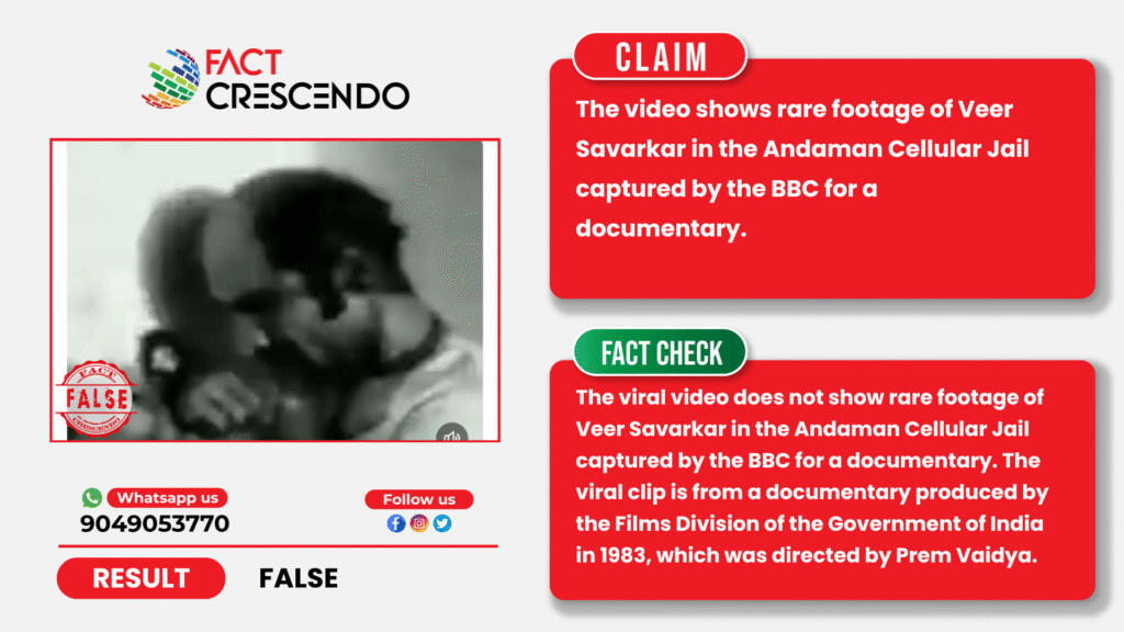 From our investigation, we can say that the claim is false. The viral video does not show rare footage of Veer Savarkar in the Andaman Cellular Jail captured by the BBC for a documentary. The viral clip is from a documentary produced by the Films Division of the Government of India in 1983, which was directed by Prem Vaidya.