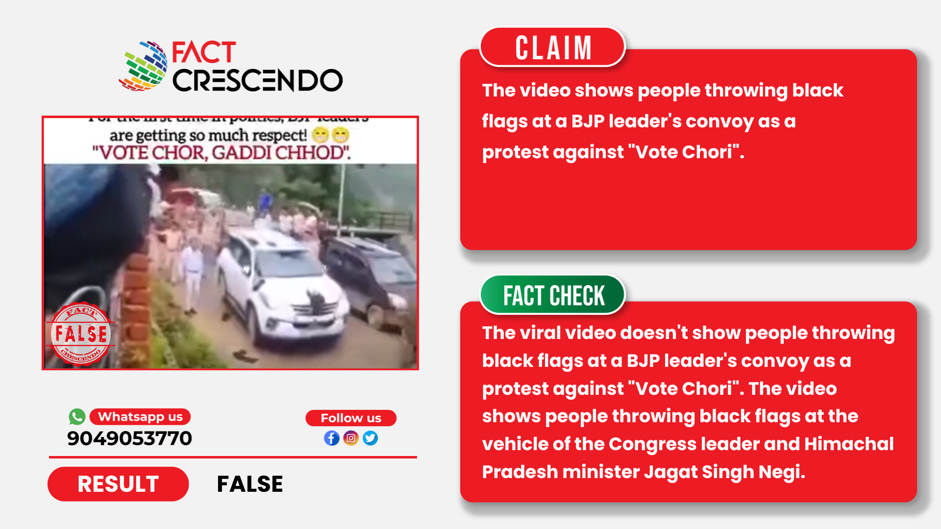 From our investigation, we can say that the claim is false. The viral video doesn’t show people throwing black flags at a BJP leader’s convoy as a protest against “Vote Chori”. The video shows people throwing black flags at the vehicle of the Congress leader and Himachal Pradesh minister Jagat Singh Negi.