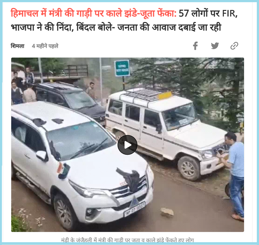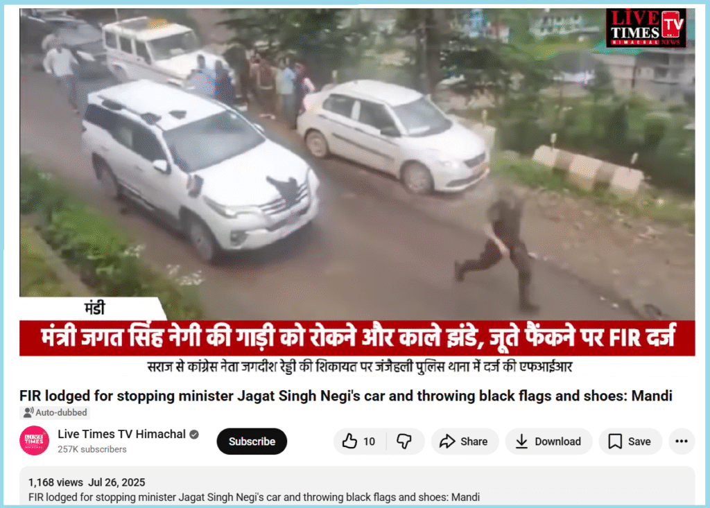 The caption of the video read, “FIR lodged for stopping minister Jagat Singh Negi’s car and throwing black flags and shoes: Mandi”.