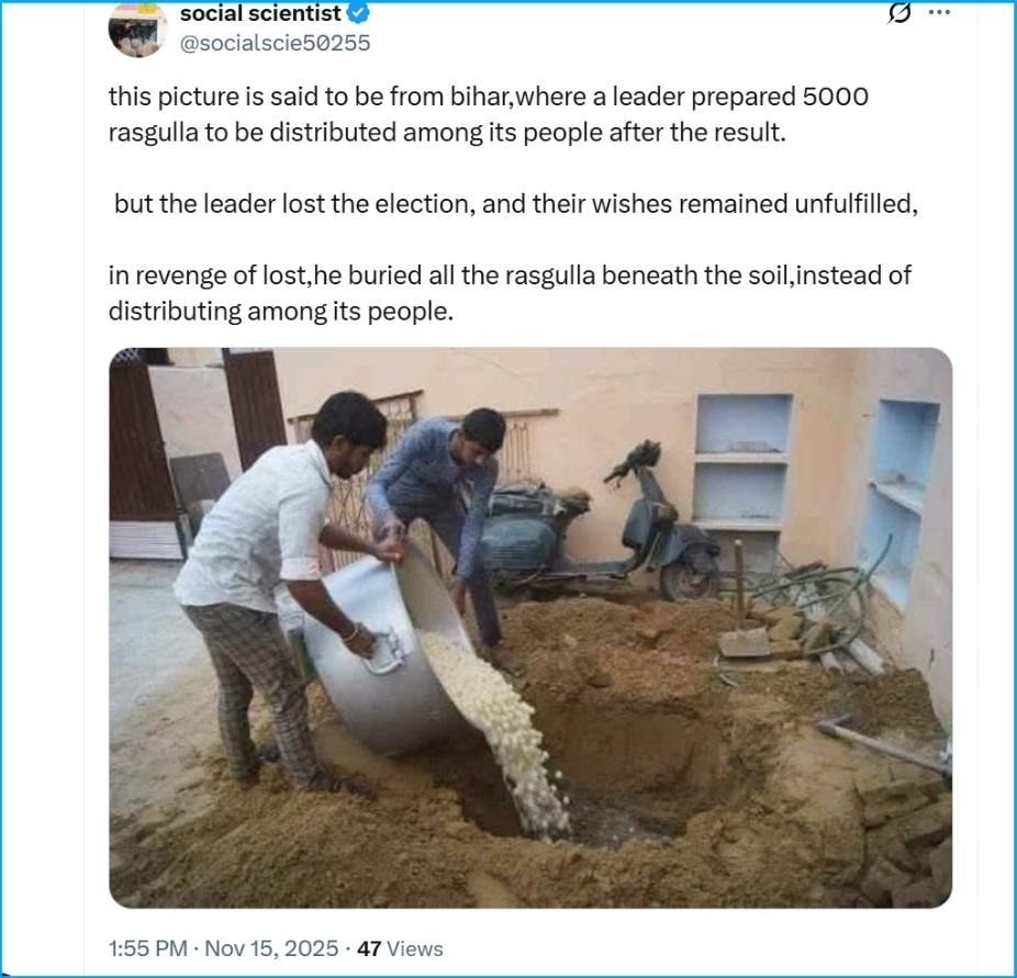 The NDA is now holding a large majority in recently concluded Bihar Assembly Elections. After the results of the elections were announced, an image is being shared on social media in which it is claimed that, RJD (Rashtriya Janata Dal) workers dumped rasgullas on the ground following their defeat in the Bihar Elections. The image shows two men pouring what appears to be a large quantity of a food item, likely a type of sweet from a large metal pot into a hole in the ground.
