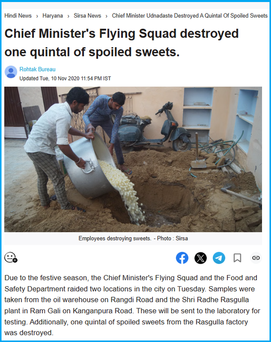We started our investigation with a reverse image search on Google and the results led us to a news report by Amar Ujala published on 10 Nov 2020. The report states that, “Due to the festive season, the Chief Minister’s Flying Squad and the Food and Safety Department raided two locations in the city. Samples were taken from the oil warehouse on Rangdi Road and the Shri Radhe Rasgulla plant in Ram Gali on Kanganpura Road. Additionally, one quintal of spoiled sweets from the Rasgulla factory was destroyed. So this image shows a food safety inspection in Sirsa, Haryana, in 2020.