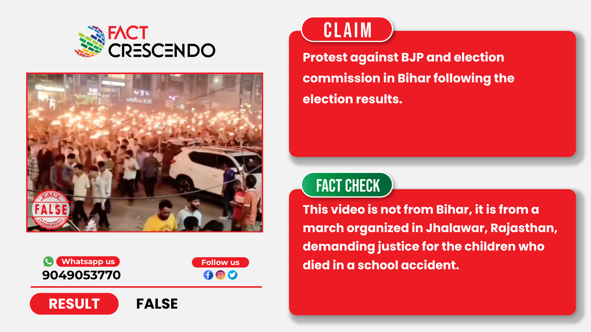 Fact Crescendo found the claim made along with the viral video to be False. This video is from a march organized in Jhalawar, Rajasthan, demanding justice for the children who died in a school accident. It has no link to Bihar and Assembly elections.