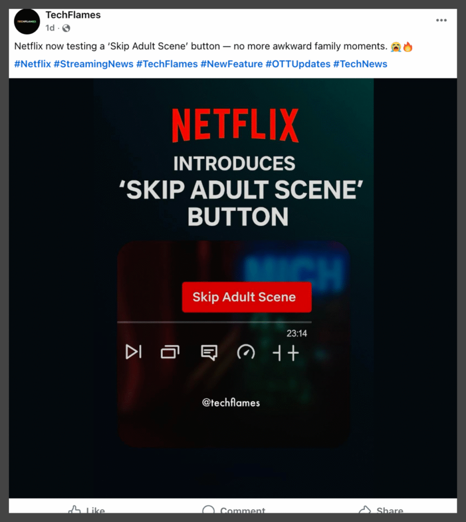 Moreover, Netflix’s official website, newsroom, press releases, and social media channels has not made any announcement regarding a “Skip Adult Scene” button. In short, while Netflix has not issued a formal public “denial,” the absence of any official release combined with consistent reporting makes clear the feature is not real.