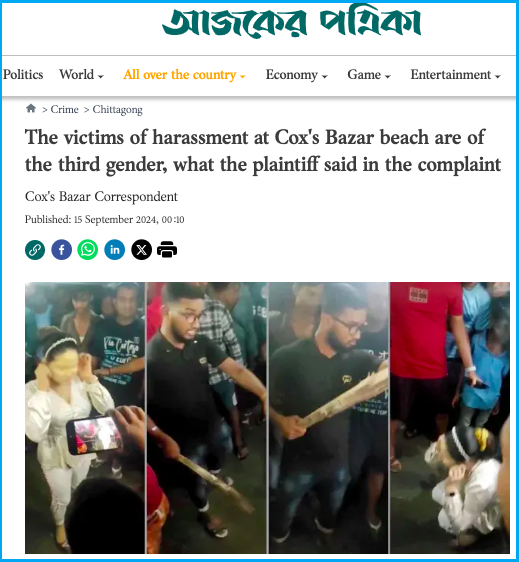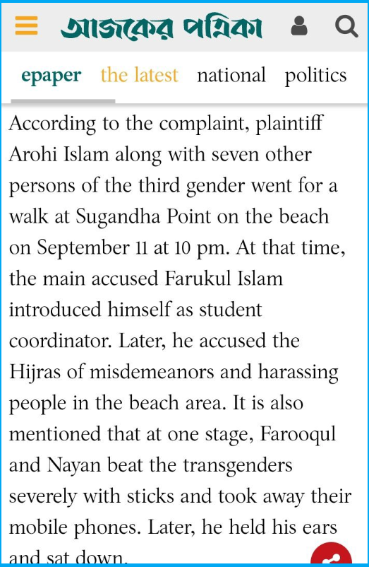 The title of the report reads, “The victims of harassment at Cox’s Bazar beach are of the third gender, as per the complaint filed.” According to the report, several women and transgender persons were harassed and assaulted by Mohammad Farukul Islam at the Sugandha Beach area of Cox’s Bazar. The Ajker Patrika report stated that the victim is Arohi Islam, who identified herself and other victims/witnesses as belonging to the third gender.