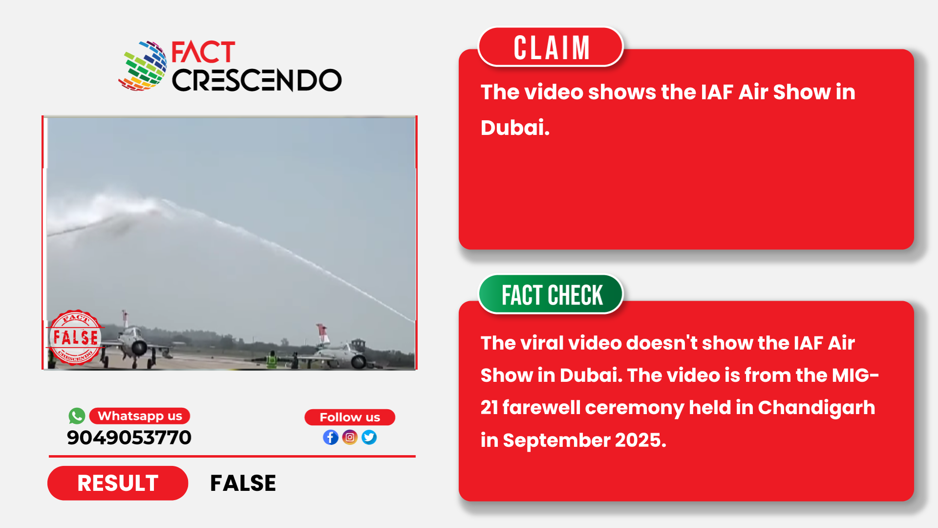 From our investigation, we can say that the claim is false. The viral video doesn’t show the IAF Air Show in Dubai. The video is from the MIG-21 farewell ceremony held in Chandigarh in September 2025.
