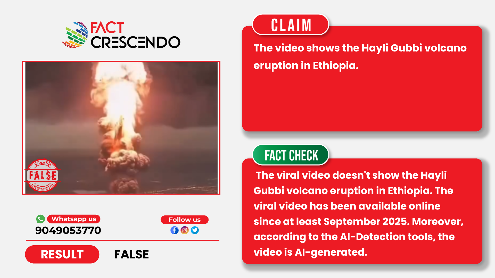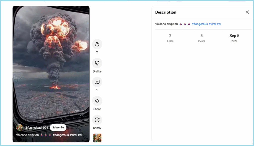 From our investigation, we can say that the claim is false. The viral video doesn’t show the Hayli Gubbi volcano eruption in Ethiopia. The viral video has been available online since at least September 2025. Moreover, according to the AI-Detection tools, the video is AI-generated.