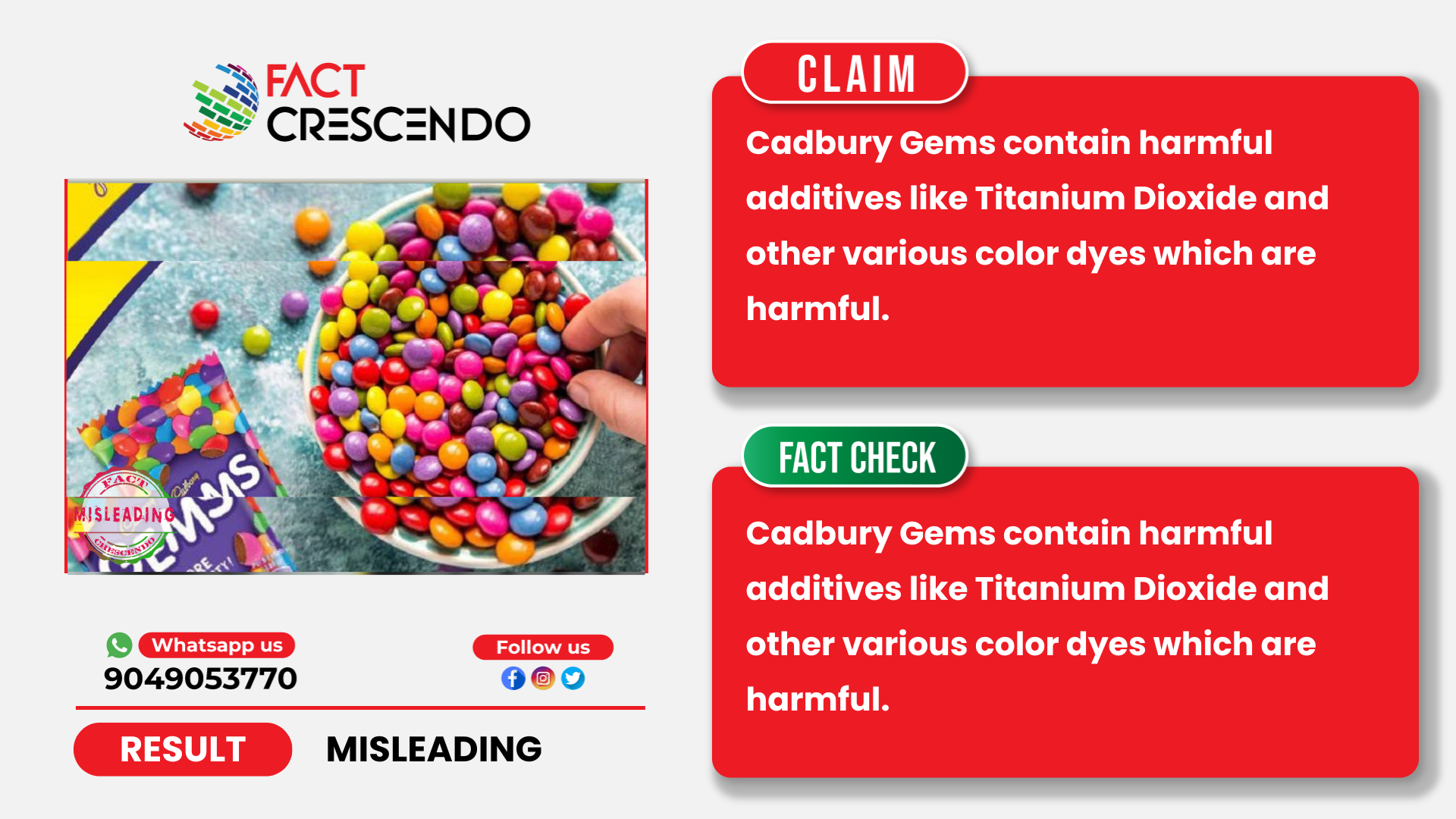 Fact Crescendo found the claim to be misleading. According to food safety regulatory bodies, the mentioned additives are safe when consumed within the set limits. The presence of these additives does not make Cadbury Gems harmful
