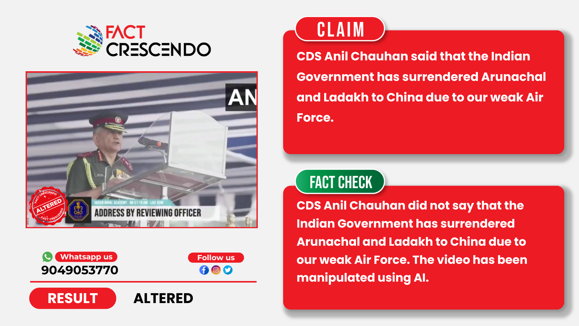 This makes it clear that the viral video has been altered. CDS Anil Chauhan did not say that the Indian Government has surrendered Arunachal and Ladakh to China due to our weak Air Force. The video has been manipulated using AI.
