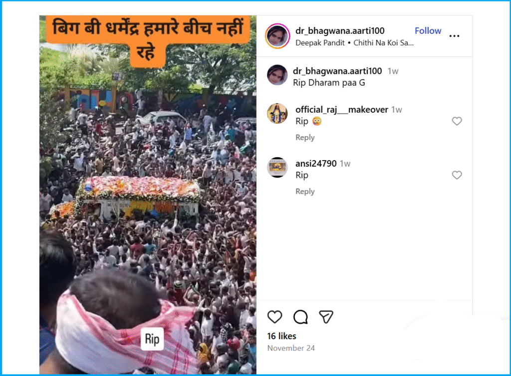 Against this backdrop, a video of a large crowd going viral on social media with claims that it showed people gathered in to pay their last respects to Dharmendra.