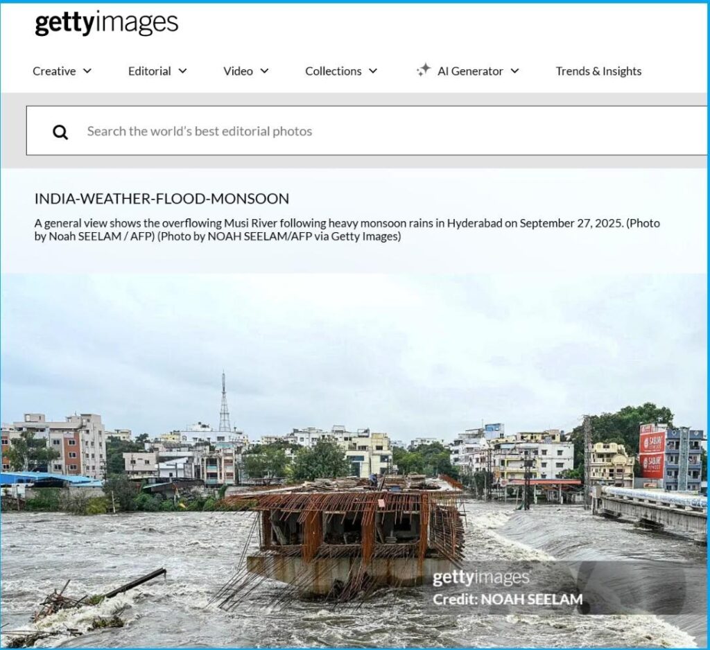 Additionally, we found the same image in the stock image website Getty Images also under the caption, “A general view shows the overflowing Musi River following heavy monsoon rains in Hyderabad on September 27, 2025.”