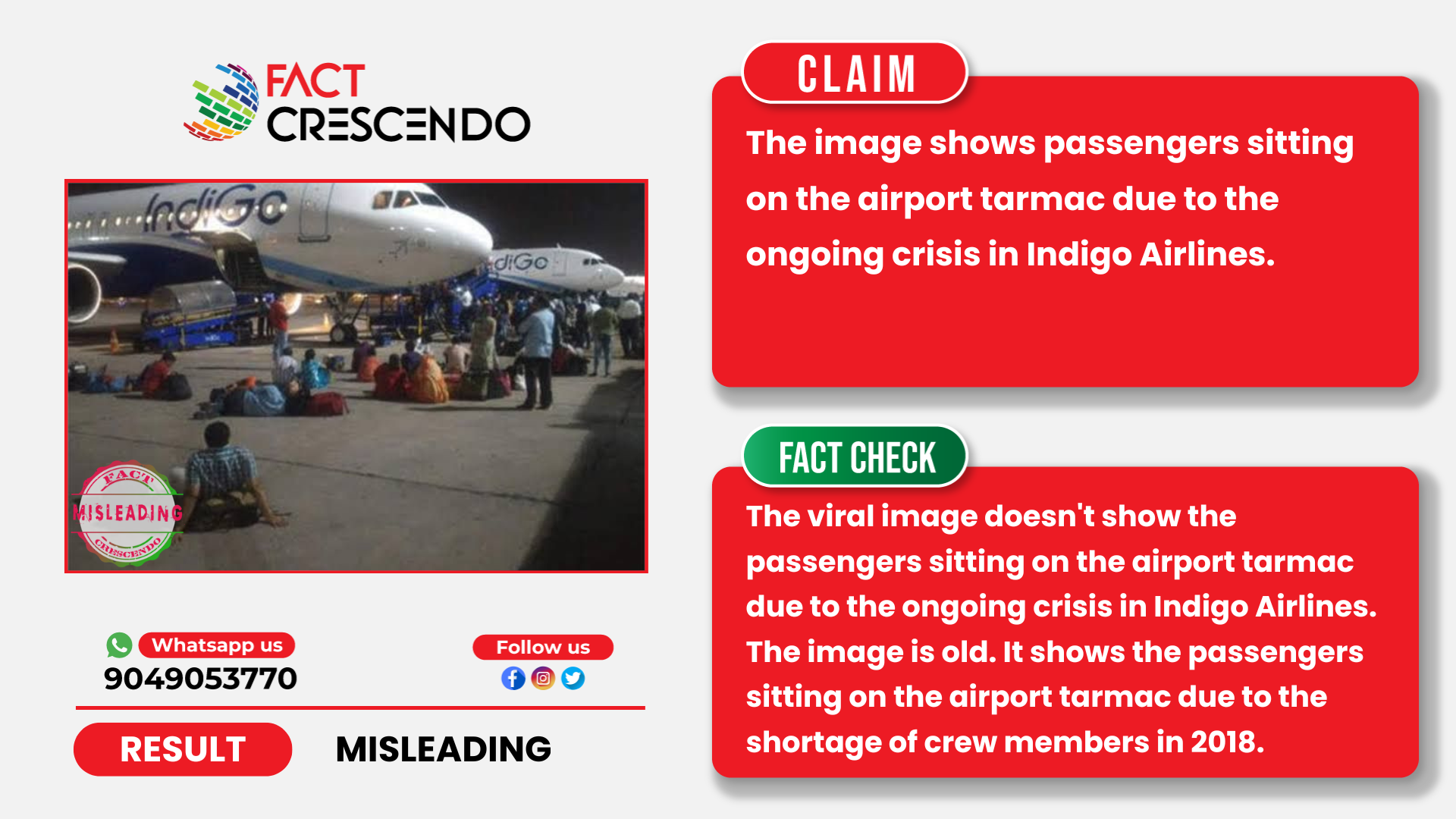 From our investigation, we can say that the claim is misleading. The viral image doesn’t show the passengers sitting on the airport tarmac due to the ongoing crisis in Indigo Airlines. The image is old. It shows the passengers sitting on the airport tarmac due to the shortage of crew members in 2018.