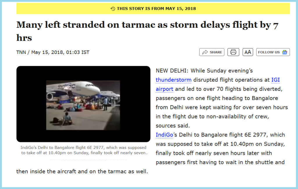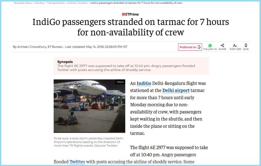 A report published in the Economic Times titled “IndiGo passengers stranded on tarmac for 7 hours for non-availability of crew”, reported the same.