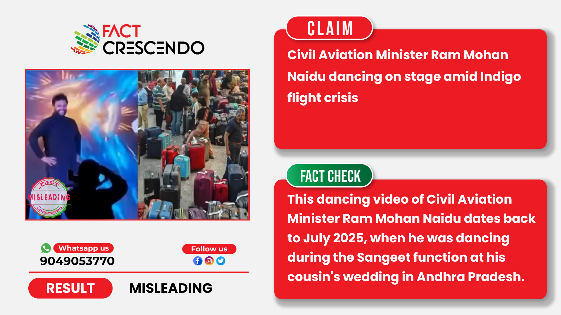 Fact Crescendo found the claim made along with the viral video to be Misleading. This dancing video of Civil Aviation Minister Ram Mohan Naidu dates back to July 2025, predating the IndiGo disruptions that began in December 2025.