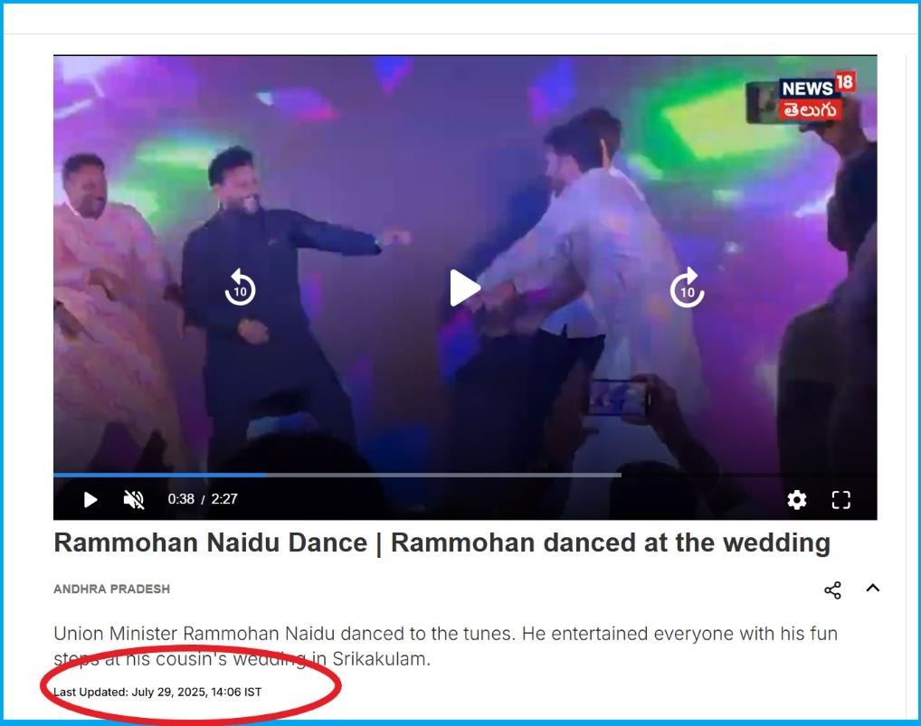 By conducting a keyword and reverse image search on Google, we found that the video was originally uploaded by a news outlet covering Telangana and Andhra Pradesh named Tone News on 29 July 2025. The caption states, Ram Mohan Naidu Dance at Sangeet Function.