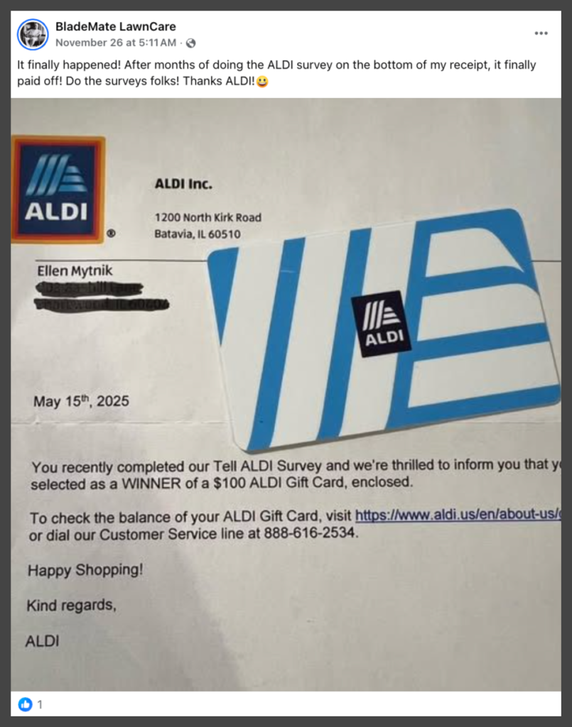 The Facebook posts claiming to offer free ALDI vouchers or gift cards for completing a short survey are scams. These promotions are not authorized by ALDI and are designed to collect personal information or redirect users to potentially harmful websites. ALDI operates legitimate customer feedback programs in some regions, but these are structured as sweepstakes with limited prizes rather than guaranteed vouchers for all participants, and they require receipt codes rather than random social media links.