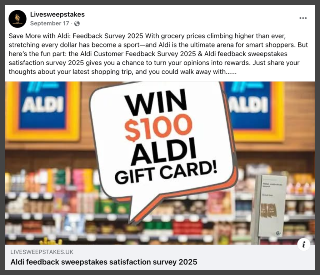 ALDI’s own social channels have also warned about fake Facebook pages impersonating the brand. In one example, ALDI USA stated that a circulating “Aldi Fans” page was a scam and not affiliated with the company, which matches a common impersonation tactic where scammers copy brand visuals to appear legitimate and then distribute off-brand links.