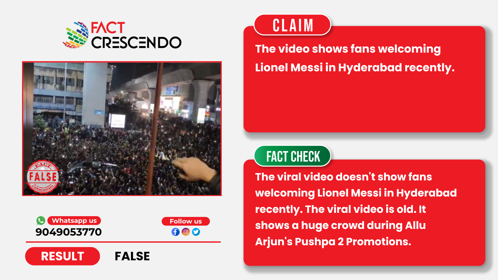 From our investigation, we can say that the claim is false. The viral video doesn’t show fans welcoming Lionel Messi in Hyderabad recently. The viral video is old. It shows a huge crowd during Allu Arjun’s Pushpa 2 Promotions.