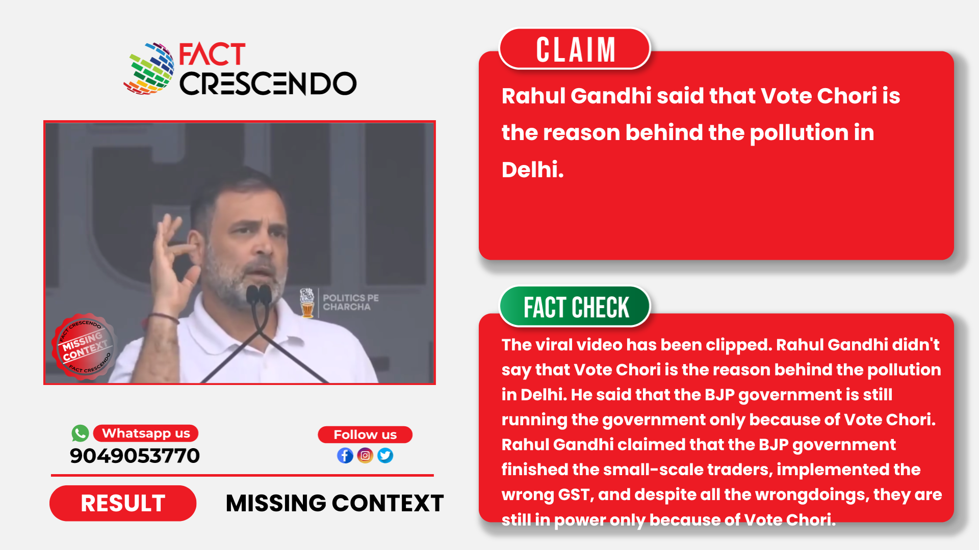 From our investigation, we can say that the claim is missing context. The viral video has been clipped. Rahul Gandhi didn’t say that Vote Chori is the reason behind the pollution in Delhi. He said that the BJP government is still running the government only because of Vote Chori. Rahul Gandhi claimed that the BJP government finished the small-scale traders, implemented the wrong GST, and despite all the wrongdoings, they are still in power only because of Vote Chori.