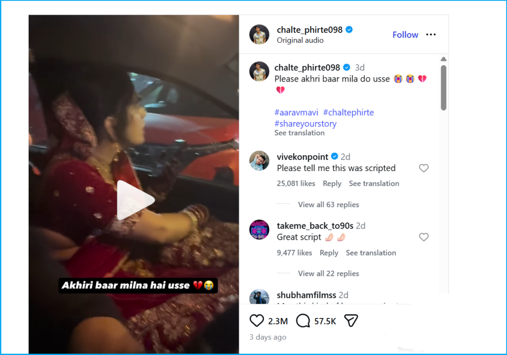 Moving forward, we found a post on Aarav’s profile dated 16 December under a caption, “This story is inspired by real events. It’s just for awareness and to touch hearts”. He explains about the viral video and says, “You might have seen a viral video I created featuring a bride running away, which unexpectedly garnered significant media attention. News channels have approached me for interviews and podcasts to discuss the video’s backstory. My followers understand that I often draw inspiration from real stories, which people share with me. I crafted this particular scene based on such a shared experience, leading to its popularity. The overwhelming response, including many trolls and memes, surprised me. I believe the video’s emotional resonance may be why it connected so deeply with viewers, prompting them to share it widely. “This story is inspired by real events. It’s just for awareness and to touch hearts”.