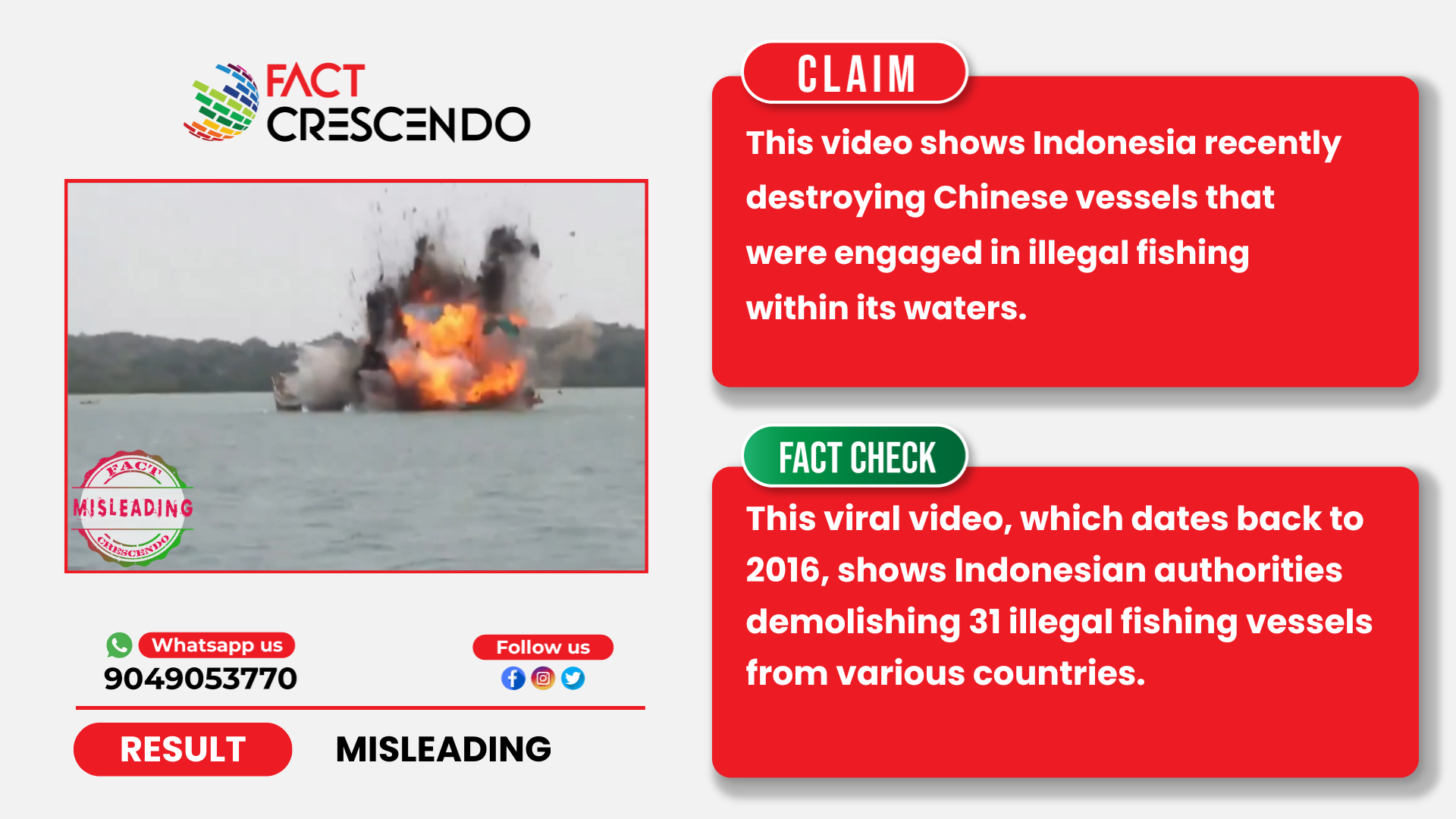 Fact Crescendo found the claim made along with the viral video to be Misleading. This viral video, which dates back to 2016, shows Indonesian authorities demolishing 31 illegal fishing vessels from various countries.