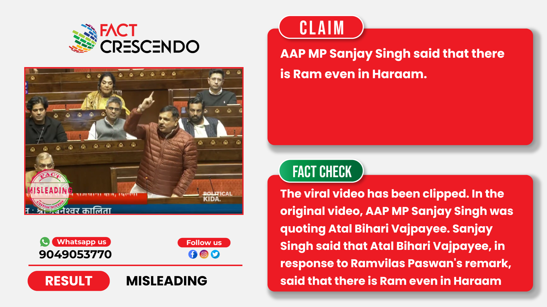 From our investigation, we can say that the claim is misleading. The viral video has been clipped. In the original video, AAP MP Sanjay Singh was quoting Atal Bihari Vajpayee. Sanjay Singh said that Atal Bihari Vajpayee, in response to Ramvilas Paswan’s remark, said that there is Ram even in Haraam.