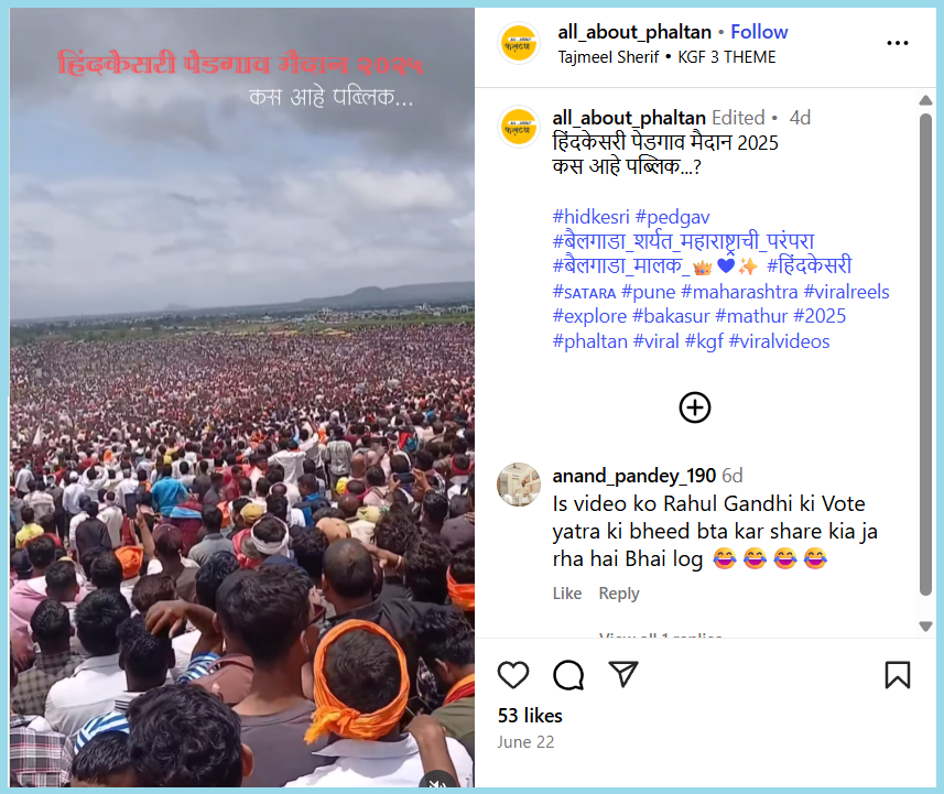 A reverse image search of the screenshots from the second clip led us to an Instagram handle where the viral clip was uploaded on 22 June 2025. According to the caption, the video was from Hindkesri Pedgaon Maidan in Maharashtra.