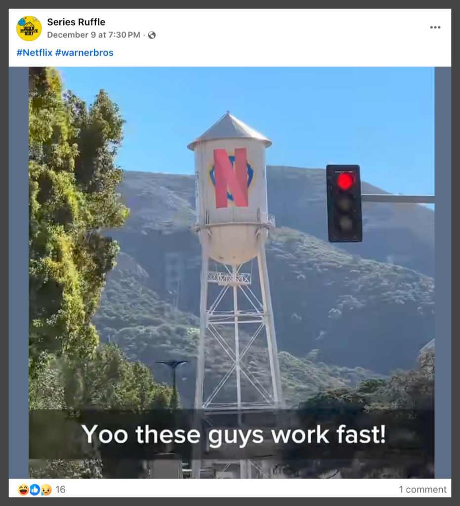 Multiple social media users shared a video and screenshots of the Warner Bros. water tower with the Netflix logo painted on top, suggesting that Netflix has already completed its acquisition of Warner Bros.