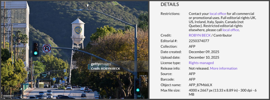 Moreover, there is no evidence that Netflix physically replaced or painted over the Warner Bros. logo on the water tower. The Warner Bros. water tower remains unchanged in real life and continues to display the Warner Bros. branding. Getty Images published editorial photographs on December 9, 2025, few days after Netflix and Warner Bros. Discovery announced their agreement, showing the original Warner Bros. shield still on the water tower at the Burbank studio. This directly contradicts claims that Netflix immediately painted over the landmark.