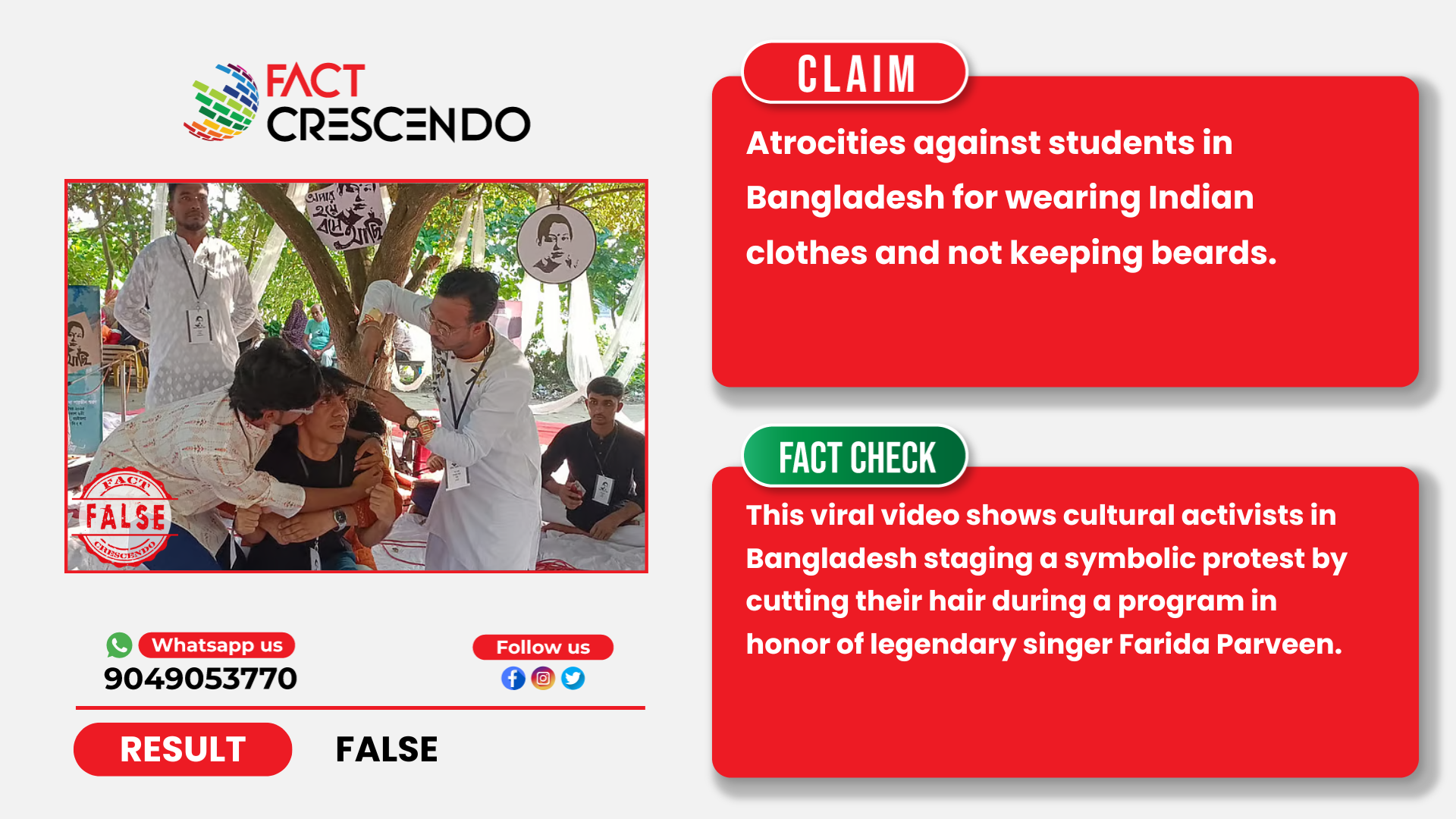 Fact crescendo found the claim made along with the viral video to be False. This viral video shows cultural activists in Bangladesh staging a symbolic protest by cutting their hair during a program in honor of legendary singer Farida Parveen.