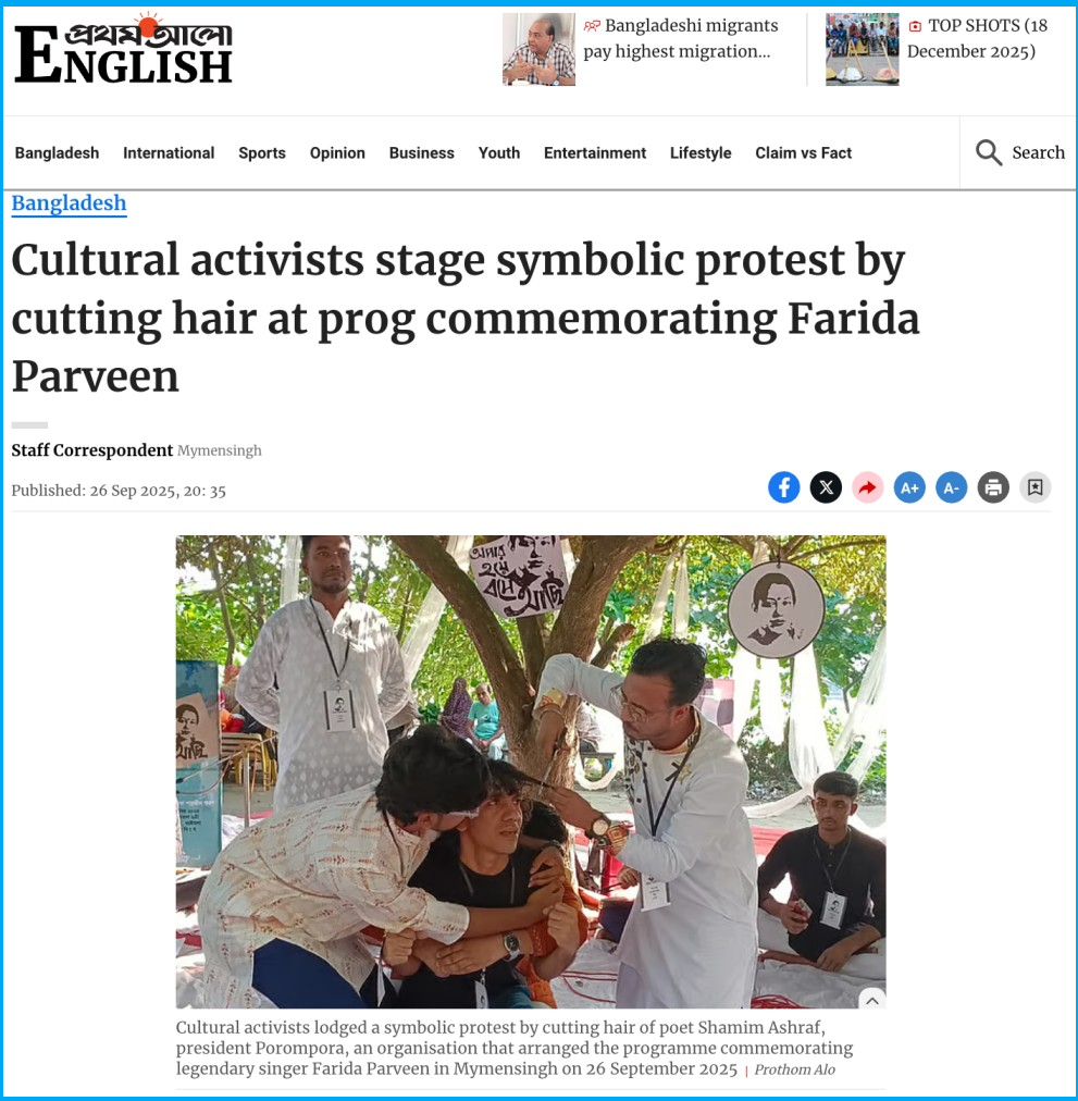 Also found a YouTube video uploaded by MCC News TV showing full coverage of the programme. The video, uploaded on September 28, titled ‘Remembering Lalankanya Farida Parveen, who cut her hair in protest on the banks of the Brahmaputra.’ Cultural activists in Mymensingh staged a symbolic protest along the Brahmaputra riverside against recent incidents of forcible hair cutting during a memorial programme for late artiste Farida Parveen, where organiser Shamim Ashraf had his hair cut to condemn attacks on shrine culture and the oppression of artists.