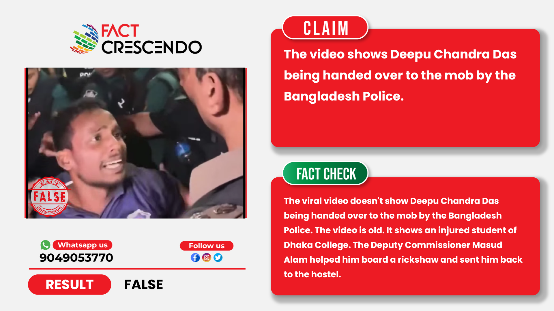 From our investigation, we can say that the claim is false. The viral video doesn’t show Deepu Chandra Das being handed over to the mob by the Bangladesh Police. The video is old. It shows an injured student of Dhaka College. The Deputy Commissioner Masud Alam helped him board a rickshaw and sent him back to the hostel.