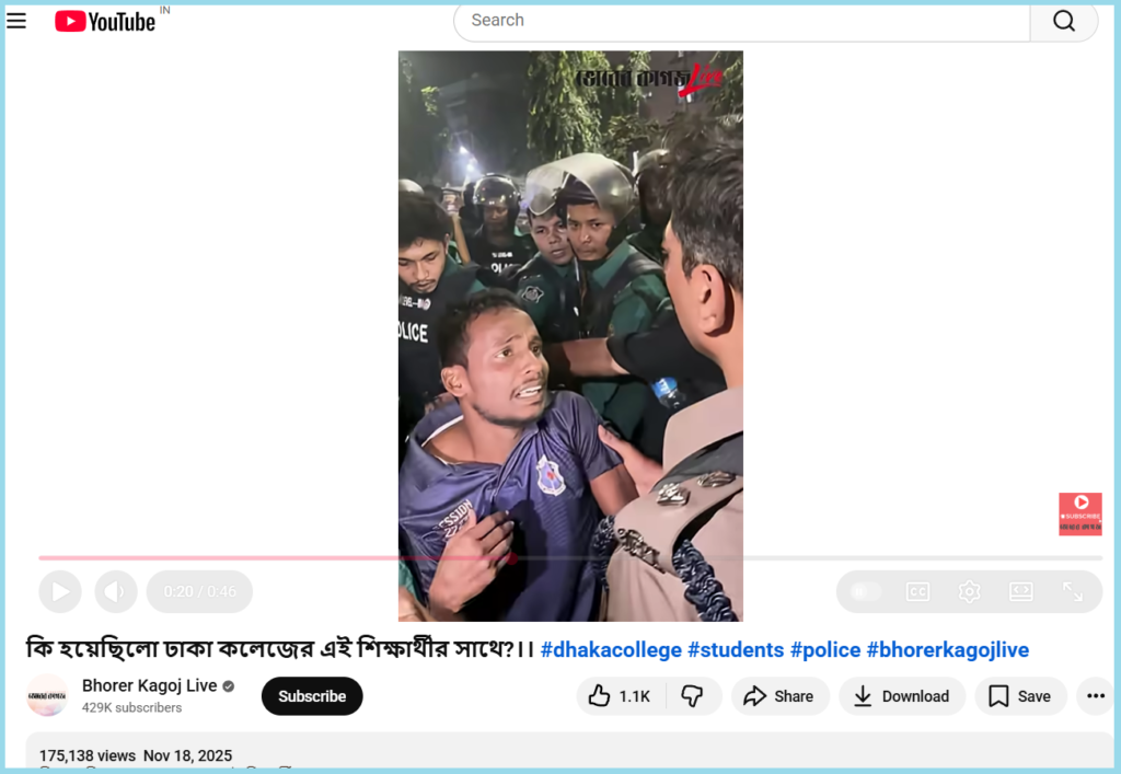 We started our investigation by taking screenshots from the viral video and conducting a reverse image search. This led us to a YouTube channel “Bhorer Kagoj Live” where a longer version of the viral video was uploaded on 18 November 2025.