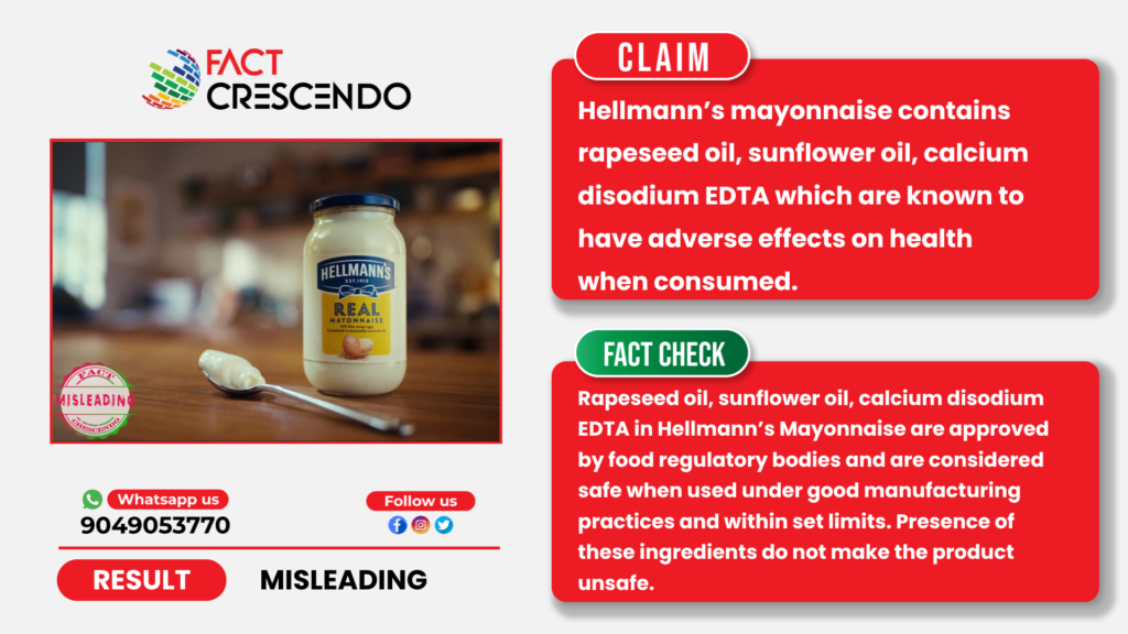 Fact Crescendo found the viral claim to be misleading. Rapeseed oil, sunflower oil, calcium disodium EDTA in Hellmann’s Mayonnaise are approved by food regulatory bodies and are considered safe when used under good manufacturing practices and within set limits.